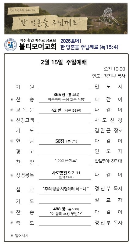 ▶ 2025년 헌금 기록이 필요하신 분들은 안내 데스크에 비치된 차트에 이름을 기록하여 주시거나, 재정부로 문의하여 주시기 바랍니다. .