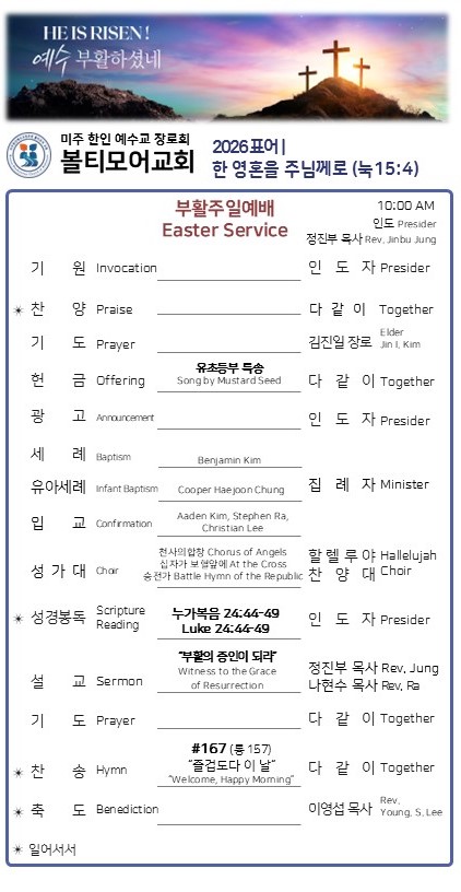 ▶ 부활주일 예배 (온교회연합예배)┃04/05 주일, 10:00AM (예배 중 유아세례, 세례 및 입교가 있습니다.)